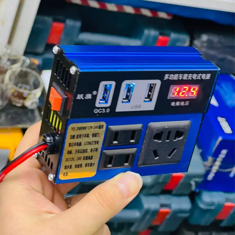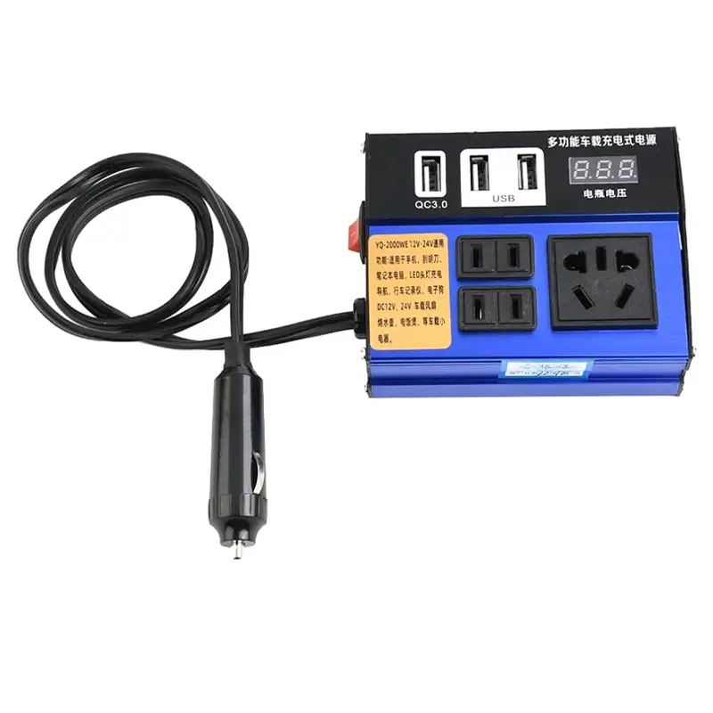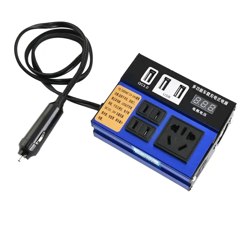 مبدل چند منظوره برق خودرو مدل YQ-2000WE قابل اتصال به باتری خودرو و همچنین فندکی ماشین برای تامین برق انواع وسایل الکترویکی شامل : لپتاپ، شارژر موبایل، تبلت، پاوربانک روشنایی LED و مهتابی یخچالهای کوچک خودرو تجهیزات نجاری سبک و ابزارهای برقی کممصرف میباشد .